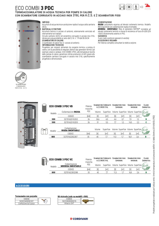 CORDIVARI - Bollitore Volano Termico VOLANO TERMICO PDC PENSILE INFORMAZIONI TECNICHE:Accumulatori inerziali CALDO-FREDDO, hanno due funzioni, quella di separazione idraulica e quella di volano termico.La separazione idraulica serve a rendere fra loro indipendenti le portate della pompa di calore da quelle dei terminali. La funzione volano termico serve a ridurre gli avviamenti delle pompe di calore.I bollitori tampone della serie pensile sono progettati per installazione a parete. MATERIALE:Acciaio al carbonio o acciaio inox. RIVESTIMENTO ESTERNO:PVC colore grigio o rivestimento esterno in lamierino protetto da un particolare trattamento anticorrosivo (per volani in CLASSE A). COIBENTAZIONE:Poliuretano espanso rigido ad elevato isolamento termico. Pensile 80 L