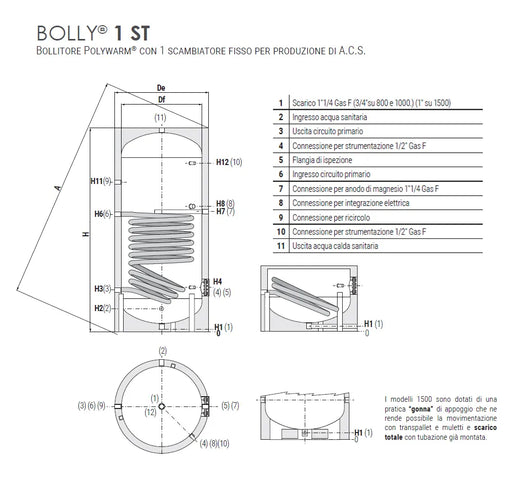 BOLLITORE POLYWARM® CON 1 SCAMBIATORE FISSO IMPIEGO Produzione ed accumulo di acqua calda sanitaria (ACS). MATERIALI E FINITURE Materiali e finiture interne, idonei per acqua potabile ai sensi del D. M. n. 174 del 06.04.04, in: Acciaio rivestito in Polywarm® (certificazioni ACS - SSICA - DVGW - W270 - UBA - WRAS) SCAMBIATORE DI CALORE 1 scambiatore di calore fisso in acciaio rivestito in Polywarm® COIBENTAZIONE Fino a 500: Coibentazione in poliuretano espanso rigido, ad elevato isolamento termico. Da 800: Coibentazione NOFIRE® in fibra di poliestere 100% riciclabile, ad elevato isolamento termico e classe di resistenza al fuoco B-s2d0 in conformità alla norma EN 13501 Rivestimento esterno, coppella superiore e copriflangia in PVC.SERIE HE: coibentazione in poliuretano espanso rigido ad elevato isolamento termico. PROTEZIONE CATODICA Anodo di magnesio (Polywarm®) SCARICO Scarico attraverso manicotto sul fondo. Modelli > lt 500 tubazione di scarico già montata. CONTROFLANGIA - GUARNIZIONI Controflangia d’ispezione in acciaio al carbonio con trattamento anticorrosivo. Guarnizioni in gomma siliconica alimentare (D.M. n.174 del 2004); resistenza in esercizio fino a 200 °C.  GARANZIA 5 anni, vedi condizioni generali di vendita