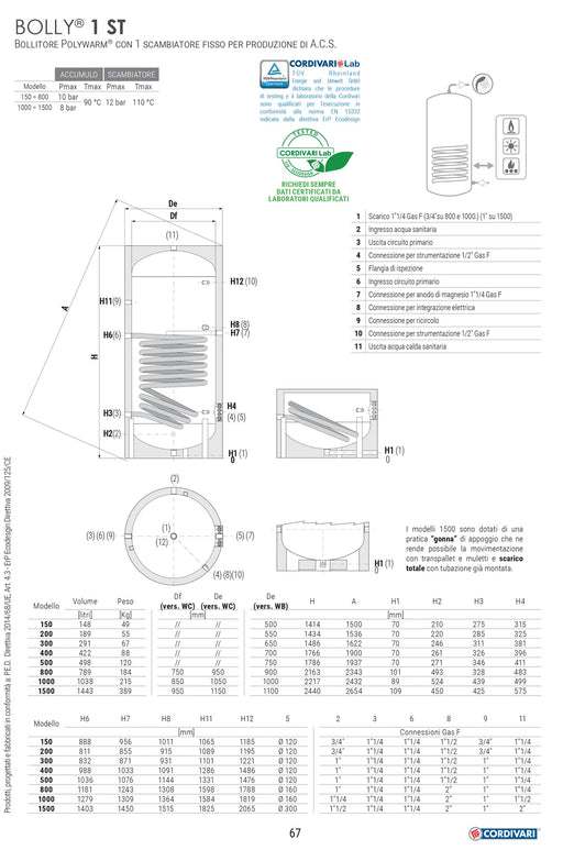 • CORDIVARI - Bollitore Polywarm Per Produzione Di Acqua Calda Sanitaria Con 2 Scambiatori Fissi 500 L - Modello: Bolly 2 ST FB CORDIVARI - Bollitore Polywarm Per Produzione Di Acqua Calda Sanitaria Con 2 Scambiatori Fissi 500 L - Modello: Bolly 2 ST FB