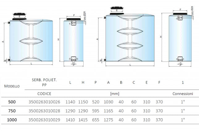SERBATOIO IN POLIETILENE CILINDRICO VERTICALE DA 500 LITRI Serbatoio in polietilene per lo stoccaggio di acqua a pressione atmosferica CARATTERISTICHE Stoccaggio acqua a pressione atmosferica Polietilene lineare atossico ad alta densità Garanzia 2 anni DOWNLOAD Scheda Tecnica INFORMAZIONI TECNICHE I Serbatoi in polietilene cilindrici verticali sono destinati allo stoccaggio di acqua a pressione atmosferica.Le principali caratteristiche sono: Polietilene lineare atossico ad alta densità. Idonei per acqua potabile. Leggeri e facili da movimentare. Resistenti agli urti e agli agenti chimici. Resistenti agli sbalzi di temperatura (-40°C +60°C). Alta resistenza fotometrica ai raggi UV. Inattaccabili da alghe. Facilmente lavabili con normali detergenti. Struttura monolitica priva di punti critici. Raccordi montati. IMPIEGO Stoccaggio di acqua a pressione atmosferica. MATERIALE Polietilene lineare atossico ad alta densità idoneo per acqua potabile a norma del D.M. n. 174 del 06.04.04.