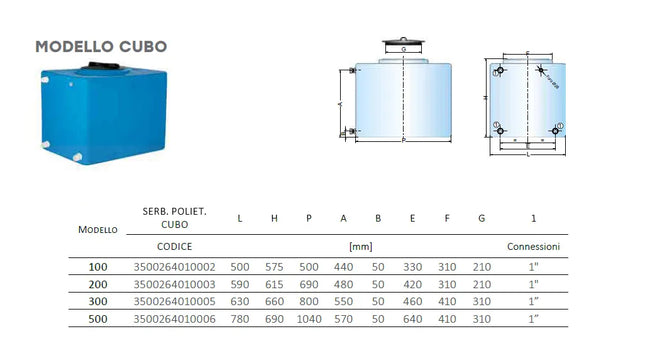 SERBATOIO IN POLIETILENE PARALLELEPIPEDO DA 500 LITRI Serbatoio in polietilene per lo stoccaggio di acqua a pressione atmosferica CARATTERISTICHE Stoccaggio acqua a pressione atmosferica Polietilene lineare atossico ad alta densità Garanzia 2 anni DOWNLOAD Scheda Tecnica INFORMAZIONI TECNICHE I Serbatoi in polietilene cilindrici verticali sono destinati allo stoccaggio di acqua a pressione atmosferica.Le principali caratteristiche sono: Polietilene lineare atossico ad alta densità. Idonei per acqua potabile. Leggeri e facili da movimentare. Resistenti agli urti e agli agenti chimici. Resistenti agli sbalzi di temperatura (-40°C +60°C). Alta resistenza fotometrica ai raggi UV. Inattaccabili da alghe. Facilmente lavabili con normali detergenti. Struttura monolitica priva di punti critici. Raccordi montati. IMPIEGO Stoccaggio di acqua a pressione atmosferica. MATERIALE Polietilene lineare atossico ad alta densità idoneo per acqua potabile a norma del D.M. n. 174 del 06.04.04.
