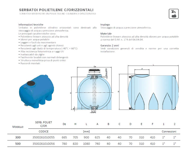 CORDIVARI Cordivari - Serbatoio orizzontale in polietilene da 500 litri per acqua potabile