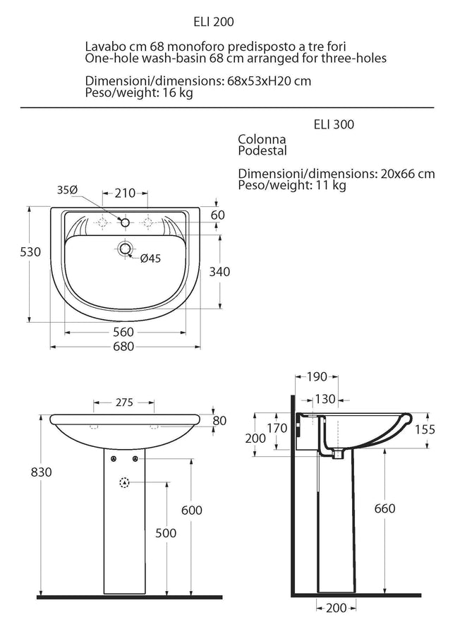 Azzurra - lavabo porcellana bianco 68 cm - serie: elios (senza colonna)