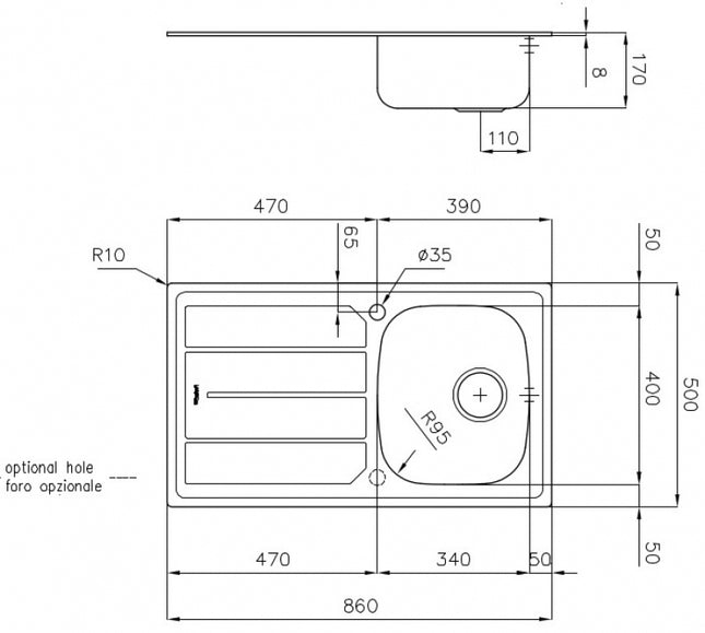 Lavello S1000 1886 560Lavello cucina ad incassoIn acciao inox AISI 304, finitura lucida, base 80-90 cm.CaratteristicheGANCI SCORREVOLI - Esclusivo sistema di installazione Foster che permette ai ganci di fissaggio di scorrere lungo tutto il perimetro del lavello. Permette una installazione agevole potendo posizionare i ganci nei punti più accessibili.PILETTA 3,5" BASKET - Lo scarico è dotato di piletta grande 3,5”, con il pratico tappo a cestello che impedisce il defluire nello scarico di parti solide. La piletta 3,5” permette l’utilizzo del dissipatore Foster, compatibile con tutti i modelli.PIÙ VALORE - Foster utilizza spessori di acciaio superiori a quelli mediamente usati dagli altri produttori. È così, grazie anche alla lunga esperienza, che sappiamo realizzare lavelli di qualità superiore e con una migliore resistenza all'invecchiamento.Dettagli Bordo Installazione: Standard (Bordo 8 mm) Dimensioni: 860x500 mm Dotazioni standard: Ganci di fissaggio, guarnizione, piletta, troppo-pieno e sifone, Imballo in scatola Fori Mixer: 1 foro di serie Foro incasso: 840x480 mm Gocciolatoio: No Larghezza: 86 cm Materiale/Finitura: Acciaio inox AISI 304 - finitura lucida Misura vasca: 340x400mm Numero vasche: 2 vasche Piletta: 3,5"