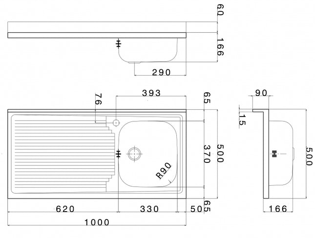 Lavello cucina in acciaio inox ad appoggio da 90 cm con bordino posteriore 1 vasca a destra con gocciolatoio a sinistra