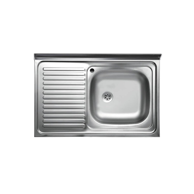 Lavello cucina in acciaio inox da appoggio con bordino 80 cm 1 vasca a sinistra con gocciolatoio a destraCaratteristiche Larghezza: 80 cm; Profondità: 50 cm; Profondità vasche: 15 cm
