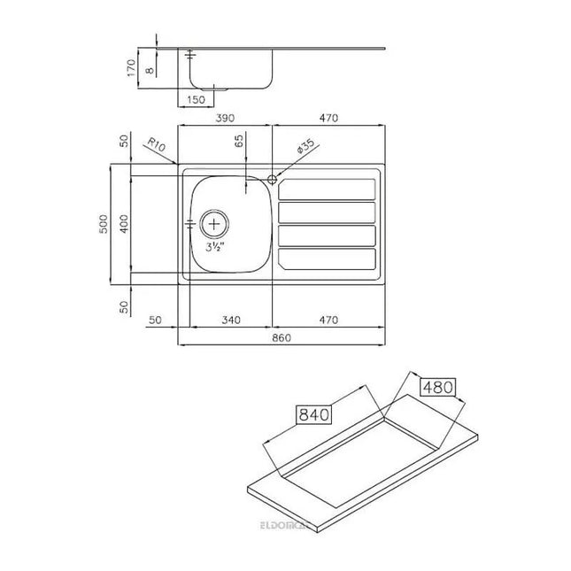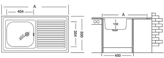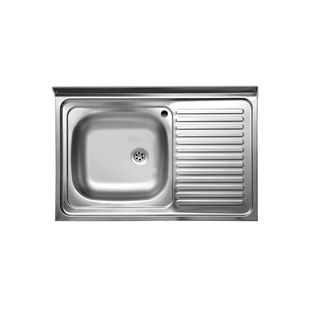 Lavello inox da appoggio con bordino 80 cm 1 vasca a destra con gocciolatoio a sinistraCaratteristiche Larghezza: 80 cm; Profondità: 50 cm; Profondità vasca: 15 cm