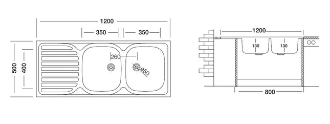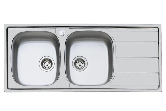 Lavello cucina in acciaio inox da appoggio con bordino 120 cm 2 vasche a destra con gocciolatoio a sinistraCaratteristiche Larghezza: 120 cm; Profondità: 50 cm; Profondità vasche: 13 cm