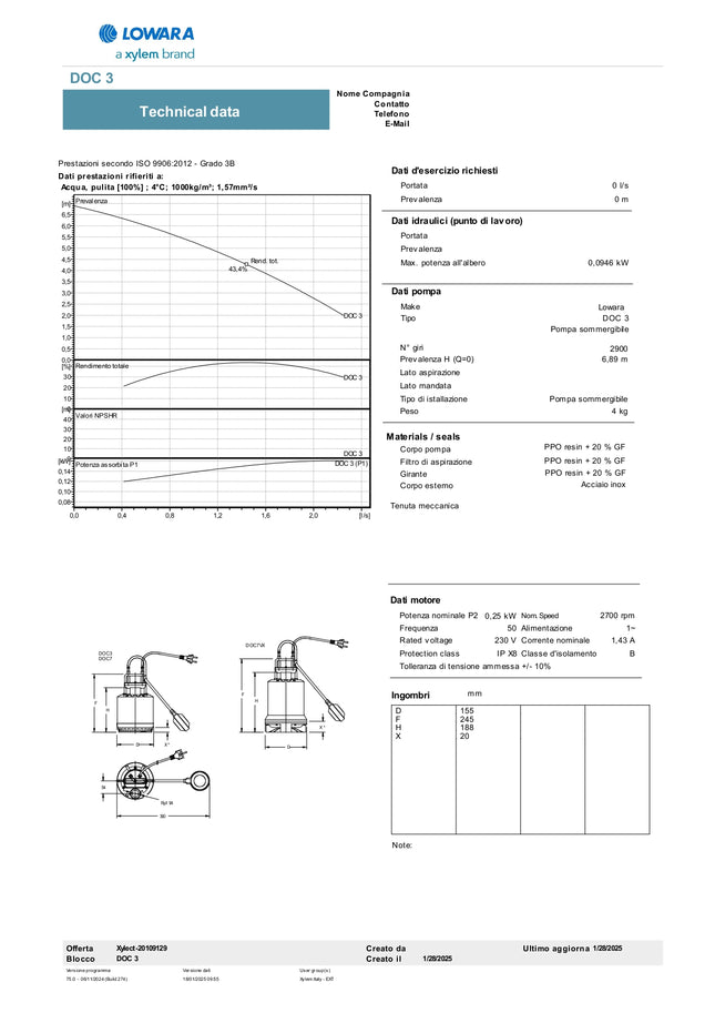 Pompa Sommergibile Lowara DOC3/A HP 0,33 kW 0,25Pompa sommersa per Acque Chiare e Sporche con 5 Metri di Cavo Monofase.Pompe sommergibili per svuotamento da pozzetti, serbatoi, vasche di raccolta, scarichi di lavaggi domestici e drenaggio d’emergenza di locali interrati come garage e cantine.Le pompe della serie DOC sono principalmente costruite in acciaio inossidabile e il motore è dotato di moto protettore termico per interrompere l’alimentazione della pompa in caso di surriscaldamento.Le versioni monofase sono dotate di condensatore integrato, galleggiante e cavo di alimentazione con spina (5 metri) che permettono il funzionamento automatico.La pompa LOWARA DOC è versatile e resistente alla corrosione con dimensioni ridotte.Parametri tecnici Temperatura massima del liquido: 40°C. Motore a secco raffreddato dal liquido pompato. Cavo di alimentazione provvisto di spina 5 metri. Isolamento in classe 130°C (B). Grado di protezione: IPX8. Profondità massima di immersione: 5 m. Galleggiante premontato per il funzionamento automatico della pompa. Condensatore integrato nella pompa. Motoprotettore termico per interrompere l’alimentazione della pompa in caso di surriscaldamento.