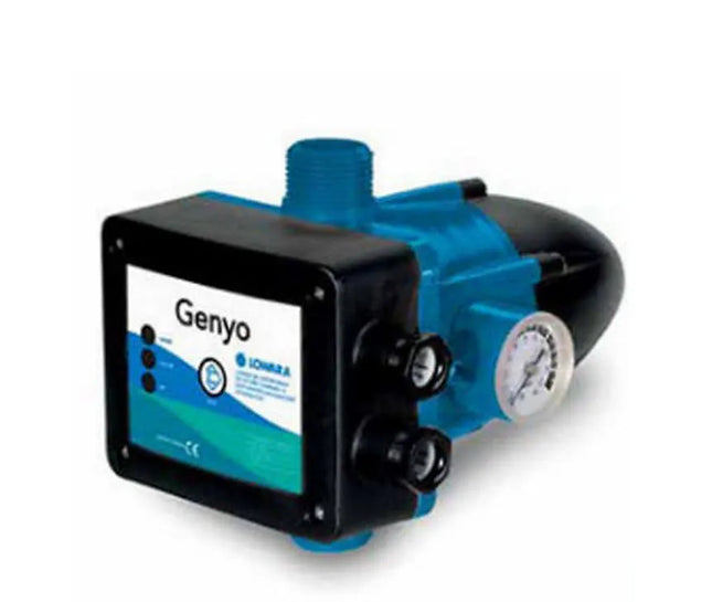 GENYO 16A Regolatore di pressione presscontrol pressostato automaticoGenyo, nuova gamma di compatti dispositivi elettronici pressoflussostati per il controllo e la protezione di elettropompe.Genyo è comandato da un circuito elettronico ed è composto da un sistema a membrana e molla antagonista integrato da sensori di portata e pressione.Genyo permette di controllare in modo automatico l’avviamento e lo spegnimento dell’elettropompa a seconda dell’effettiva richiesta d’acqua, evitando variazioni di pressione all’utilizzo a punto di lavoro costante.Genyo integra, in un unico dispositivo, molti accessori d’impianto. Disponibile versione 8A a tre pressioni di partenza fisse (GENYO 8A), e versione 16A con riavvio automatico (GENYO 16A).Parametri tecnici Portata: fino a 10 m³/h Alimentazione: mono e tri-fase 50 e 60 Hz Potenza: fino a 2,20 kW Pressione massima: 10 bar Temperatura del liquido a 60 °C