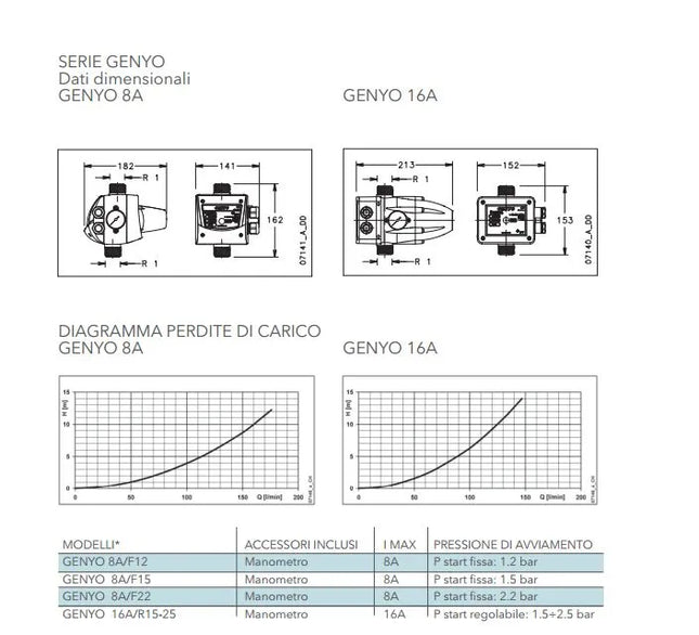GENYO 8A/F15 Regolatore di pressione presscontrol pressostato automaticoGenyo, nuova gamma di compatti dispositivi elettronici pressoflussostati per il controllo e la protezione di elettropompe.Genyo è comandato da un circuito elettronico ed è composto da un sistema a membrana e molla antagonista integrato da sensori di portata e pressione.Genyo permette di controllare in modo automatico l’avviamento e lo spegnimento dell’elettropompa a seconda dell’effettiva richiesta d’acqua, evitando variazioni di pressione all’utilizzo a punto di lavoro costante.Genyo integra, in un unico dispositivo, molti accessori d’impianto. Disponibile versione 8A a tre pressioni di partenza fisse (GENYO 8A), e versione 16A con riavvio automatico (GENYO 16A).Parametri tecnici Portata: fino a 10 m³/h Alimentazione: mono e tri-fase 50 e 60 Hz Potenza: fino a 2,20 kW Pressione massima: 10 bar Temperatura del liquido a 60 °C
