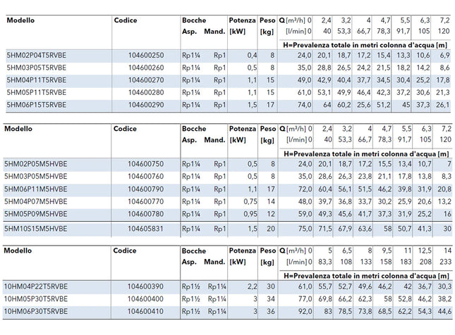 Pompa HM centrifuga orizzontale multistadio in acciaioLa NUOVA serie e-HM: moderna, robusta e gamma più ampia.Il design dell’idraulica combinato con i motori IE3 garantiscono minimi costi di esercizio.Il nuovo corpo pompa, i cuscinetti di alta qualità e l’uso dell’acciaio inox garantiscono una lunga durata.L’idraulica e il motore ad alto rendimento, combinati con il nuovo corpo pompa, riducono il rumore al minimo.e-HM per applicazioni residenziali: approvvigionamento idrico affidabile per tutti i tipi di costruzioni; dalla casa unifamiliare al condominio di 10 piani. La nuova e-HM è disponibile in diverse versioni:Pompa compattaImpianto On/ off con pressostato e serbatoio a pressione.Impianto a pressione controllata tramite il comando elettronico Genyo.Impianto a pressione costante con pompa a velocità variabile.e-HM per applicazioni industriali: offerta completa per numerose applicazioni quali l’industria del lavaggio e della pulizia, il trattamento delle acque e processi nell’industria agroalimentare.AISI 304 or 316Lucidatura elettrolitica e passivazione.Versioni compatte e ad alta efficienza.Opzioni nella scelta delle tenute meccaniche e degli OR.Parametri tecnici Specifiche Portata: fino a 29 m³/h Prevalenza: fino a 160 m Alimentazione: mono e tri-fase 50 e 60 Hz Potenza: da 0,30 kW fino a 5,50 kW Pressione massima: 16 bar Temperatura del liquido da -10 °C a 120 °C
