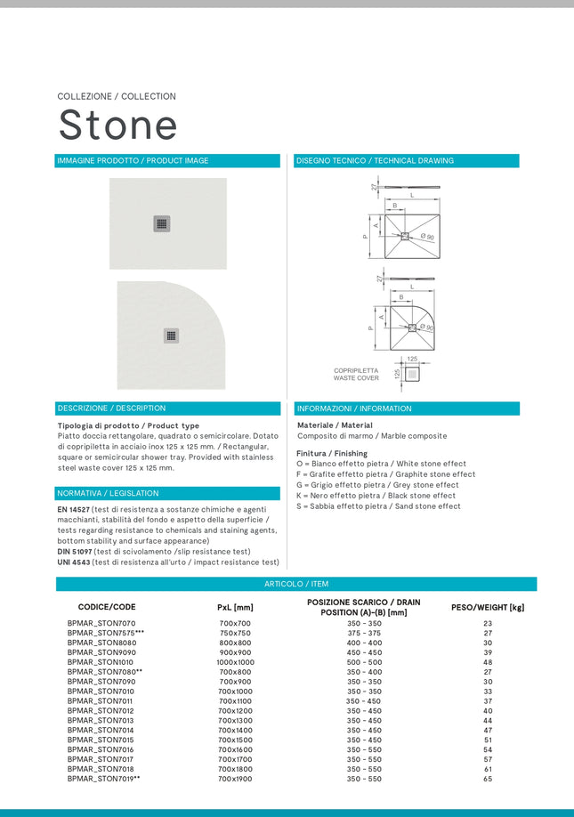 CARATTERISTICHE TECNICHE Diametro scarico (mm): 900 Forma: quadrata Altezza (mm): 550 Materiale: porcellana Profondità: piatta Raccomandazione per l'installazione: alta Tipo di installazione: incasso/nicchia Tipo di fondo antiscivolo: integrato