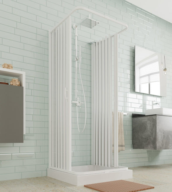 ALFA Cabina doccia ad angolo con apertura a soffietto laterale e chiusura magnetica. Caratteristiche Profilo in PVC Chiusura magnetica Materiali riciclabili Installazione reversibile Lunghezza riducibile Colori Bianco pastello Finitura pannelli Pannello ondulato PVC “Millerighi” Dimensioni 75×90→55×70 cm Ingresso massimo: 85 cm Raggio: 14 cm