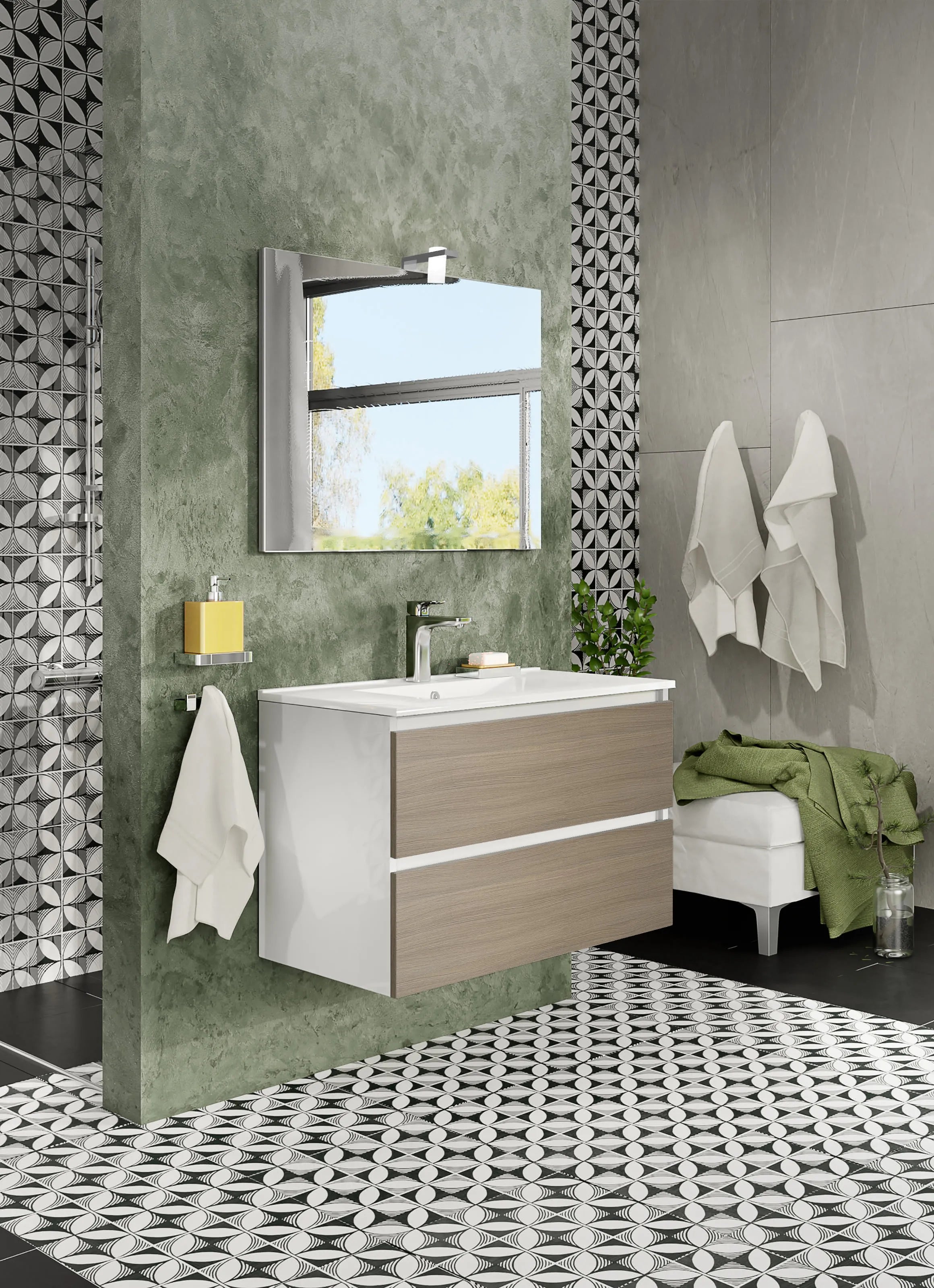 Savinidue - Cube Composizione Sospesa A 2 Cassetti Colore Rovere Grigio Da 100Cm (Compreso Lavabo - Lampada - Specchiera)