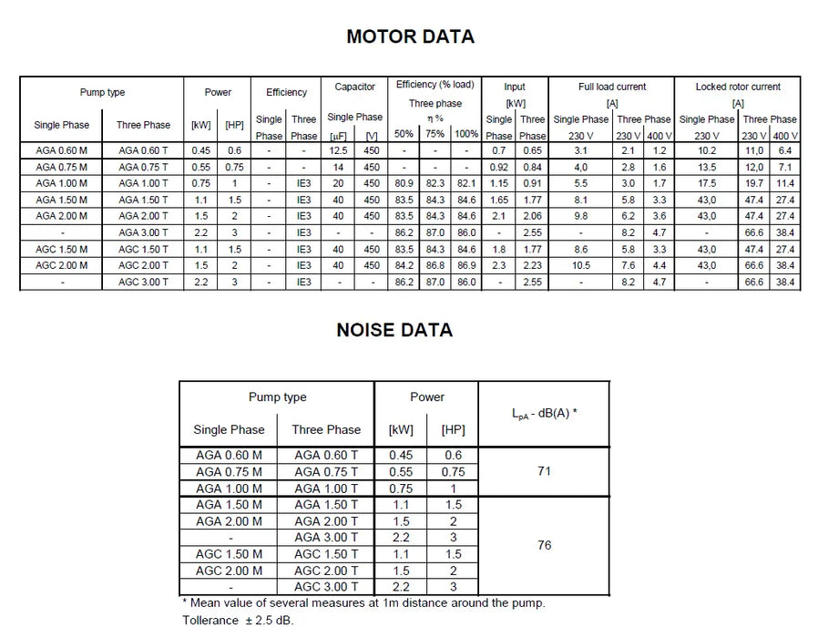 La tenuta meccanica è in Ceramica/Carbone/NBR. I motori, asincroni a 2 poli autoventilati, sono ad alta efficienza energetica IE3 a partire da 0,75 kW