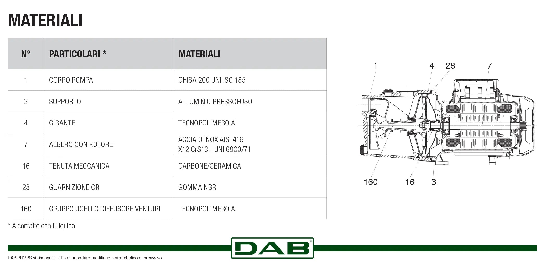 - Girante, diffusore, tubo venturi e parasabbia in tecnopolimero.
