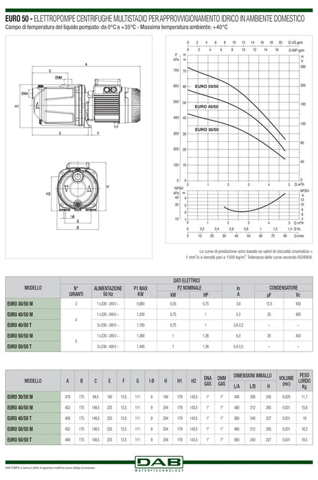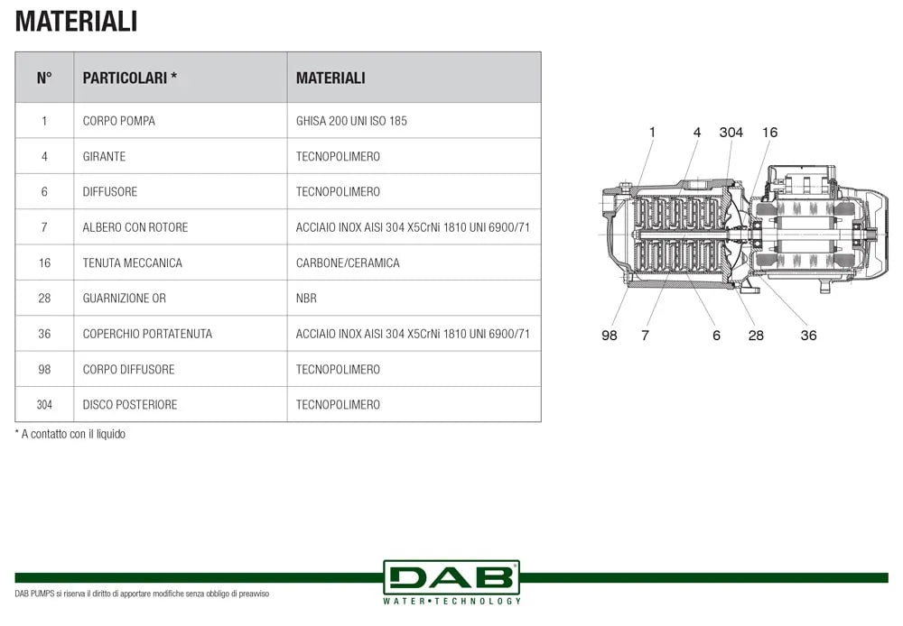 Corpo pompa in ghisa 200 UNI ISO 185. Supporto motore in alluminio pressofuso, coperchio portatenuta in acciaio AISI 304. Tenuta meccanica in carbone/ceramica. Albero rotore in acciaio AISI 304. Giranti, corpi diffusore e diffusori in tecnopolimero. Anelli di rasamento in acciaio inossidabile.