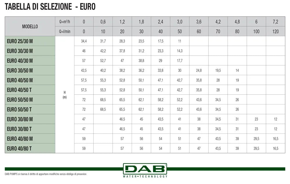 da 10 a 120 litri/min. con prevalenza fino a 72 m.
