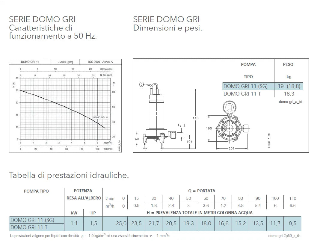 Pompa DOMO GRI 11T sommergibile trituratrice drenaggio acque sporche trifase.Le elettropompe della serie DOMO GRI sono equipaggiate con un sistema... Per saperne di più