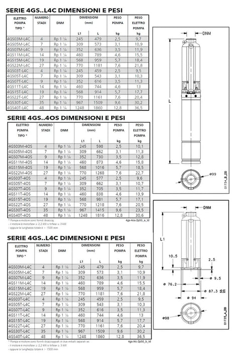 Lowara - Elettropompa Sommersa 3 HP 220V in acciaio inox per pozzo uscita 1"1/4 - 4 m³/h - Modello: 4GS