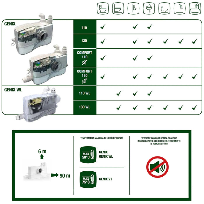 GENIX è indispensabile nei casi in cui le acque di rifiuto di wc, docce, lavabi, bidet o elettrodomestici non possano essere espulse per gravità.