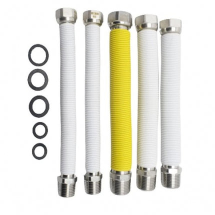 Kit blister flessibili inox con rivestimento bianco per allacciamento caldaia e scaldino 220-420 mm (2 flessibili 1/2" acqua - 2 flessibili 3/4" acqua - 1 flessibile 3/4" gas)