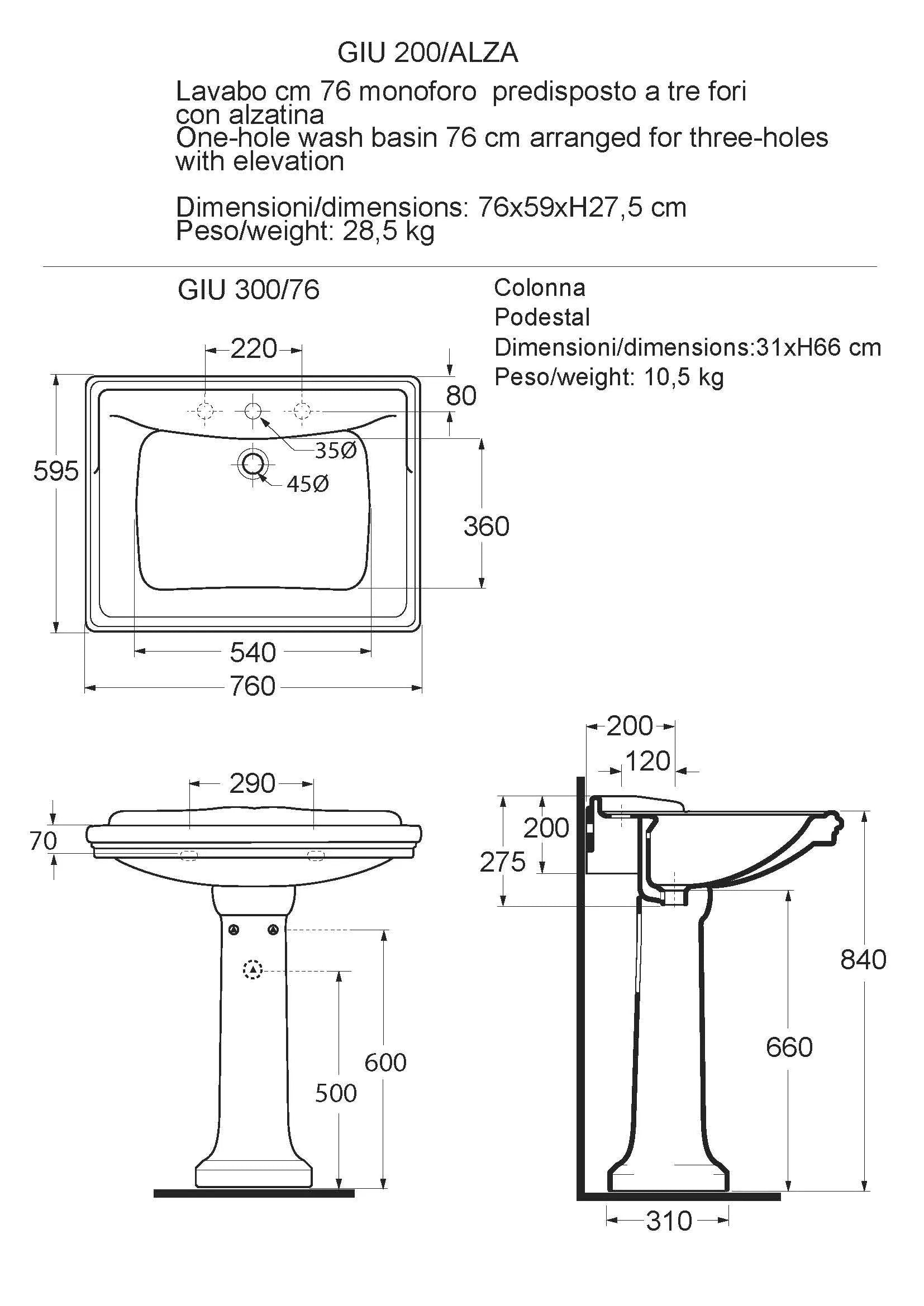 Azzurra - Lavabo Con Alzatina 76 Cm Porcellana Bianco - Serie: Giunone (Senza Colonna)