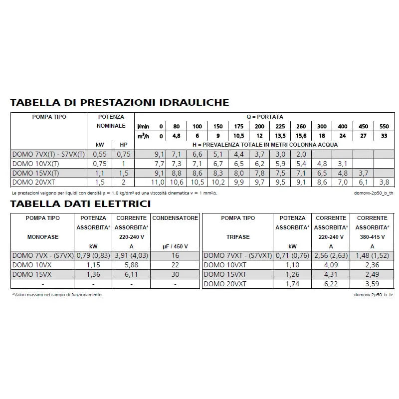 Girante in tecnopolimero rinforzato con fibra di vetro (disponibili anche DOMO S7 e DOMO S7VX con girante in acciaio inossidabile).